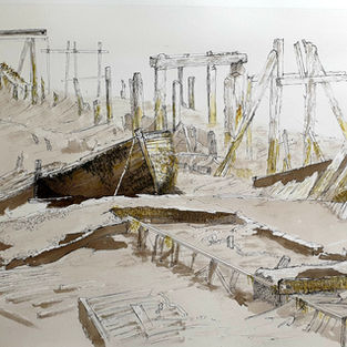 This drawing caught our attention for it’s interpretation of a scene of building chaos or demolition, somehow an order and sense of drama is achieved through the line drawing and wash, very clever and a lovely work.